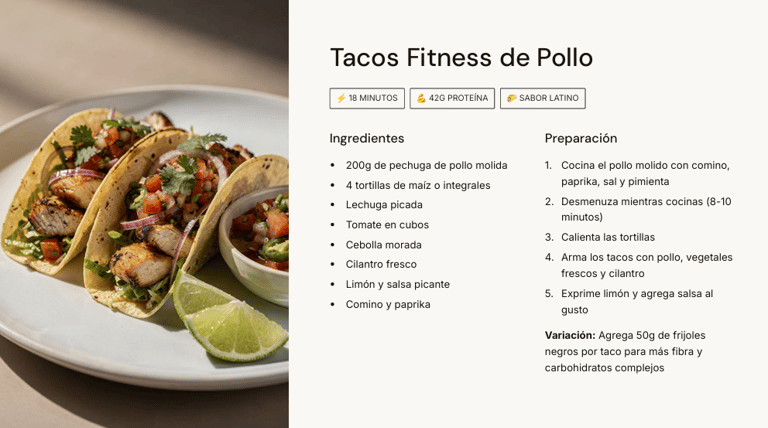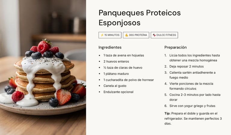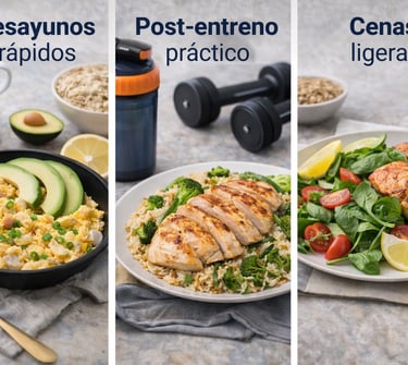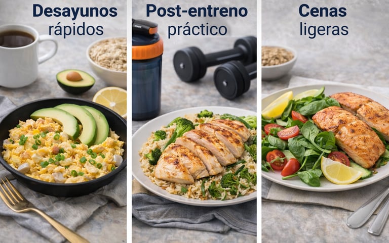 Encontrarás ideas para cada momento del día, con preparaciones simples y pensadas para personas reales que entrenan y tienen poco tiempo.